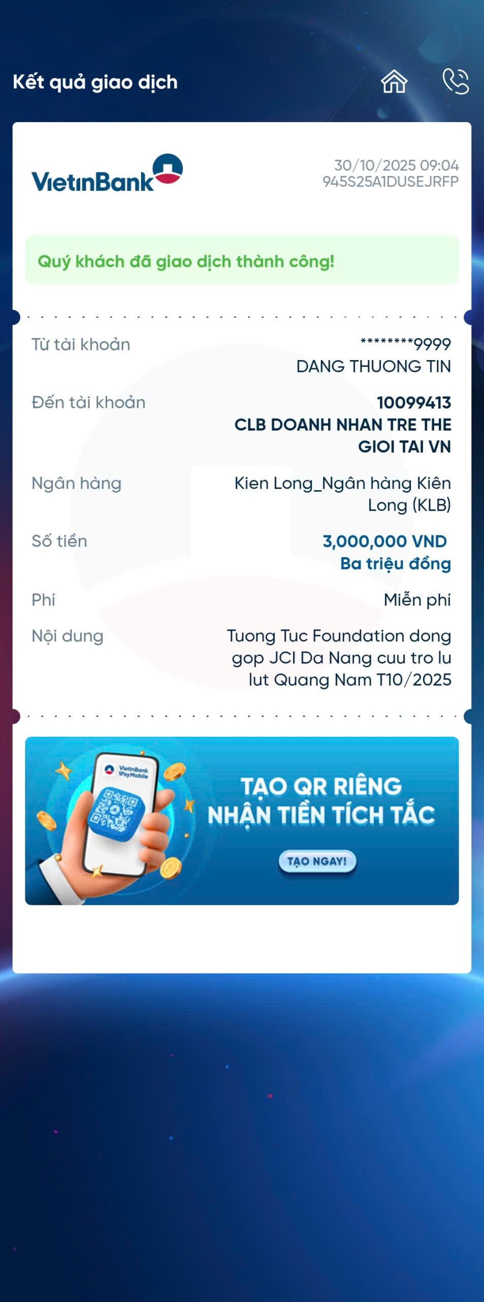 👉 Đồng thời, Tương Tức Foundation đã ủng hộ 3.000.000 đồng cho JCI Huế và 3.000.000 đồng cho JCI Đà Nẵng như một nghĩa cử nhỏ bé góp phần lan tỏa yêu thương.