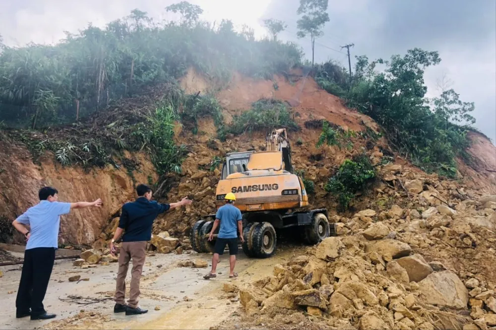 Xe múc đang khơi thông điểm sạt lở — nhiều tuyến đường miền núi bị vùi lấp. |