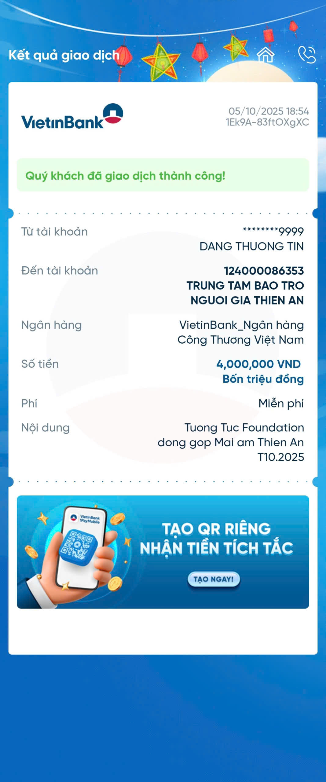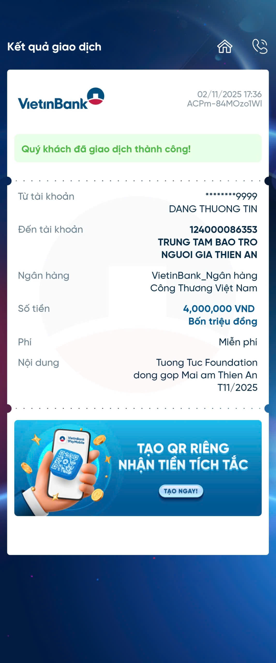 Các chi tiêu chính của mái ấm cho hơn 100 cụ già gồm: tiền điện nước, tiền ăn, tiền tã, tiền khám chữa bệnh…Phần tài chính này được đóng góp từ Quỹ bác ái của nhà Dòng và một phần là đóng góp bởi các mạnh thường quân. Từ tháng 7/2020 cho đến nay, Tương Tức Foundation đóng góp mỗi tháng một khoản tiền đồng hành của mái ấm!